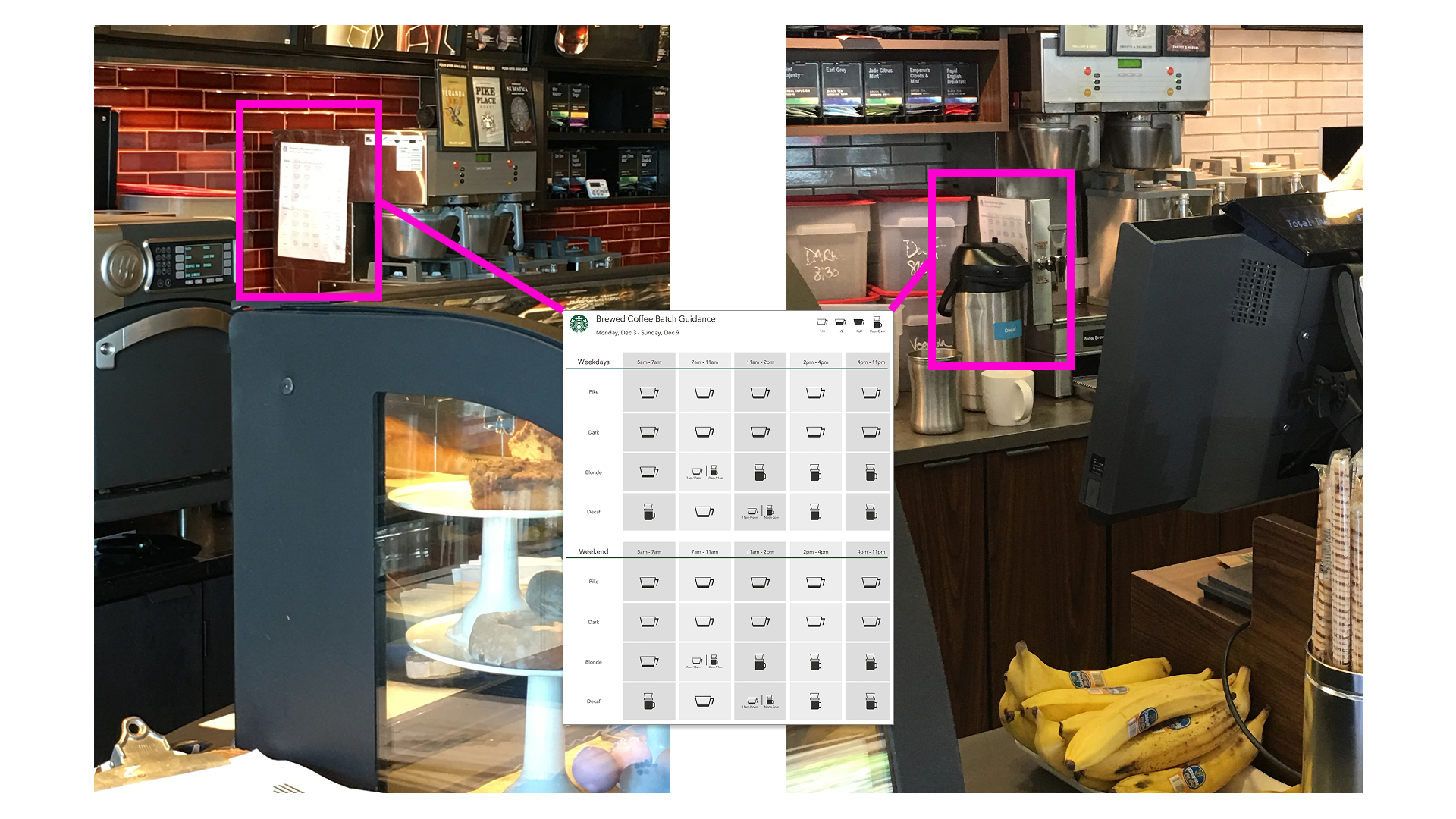 Background: Starbucks has operationalized how/when they brew their beverages. Each store has its own guidance depending on the volume of the store and what time of day it is. The batch guidance for stores was printed out on paper daily.