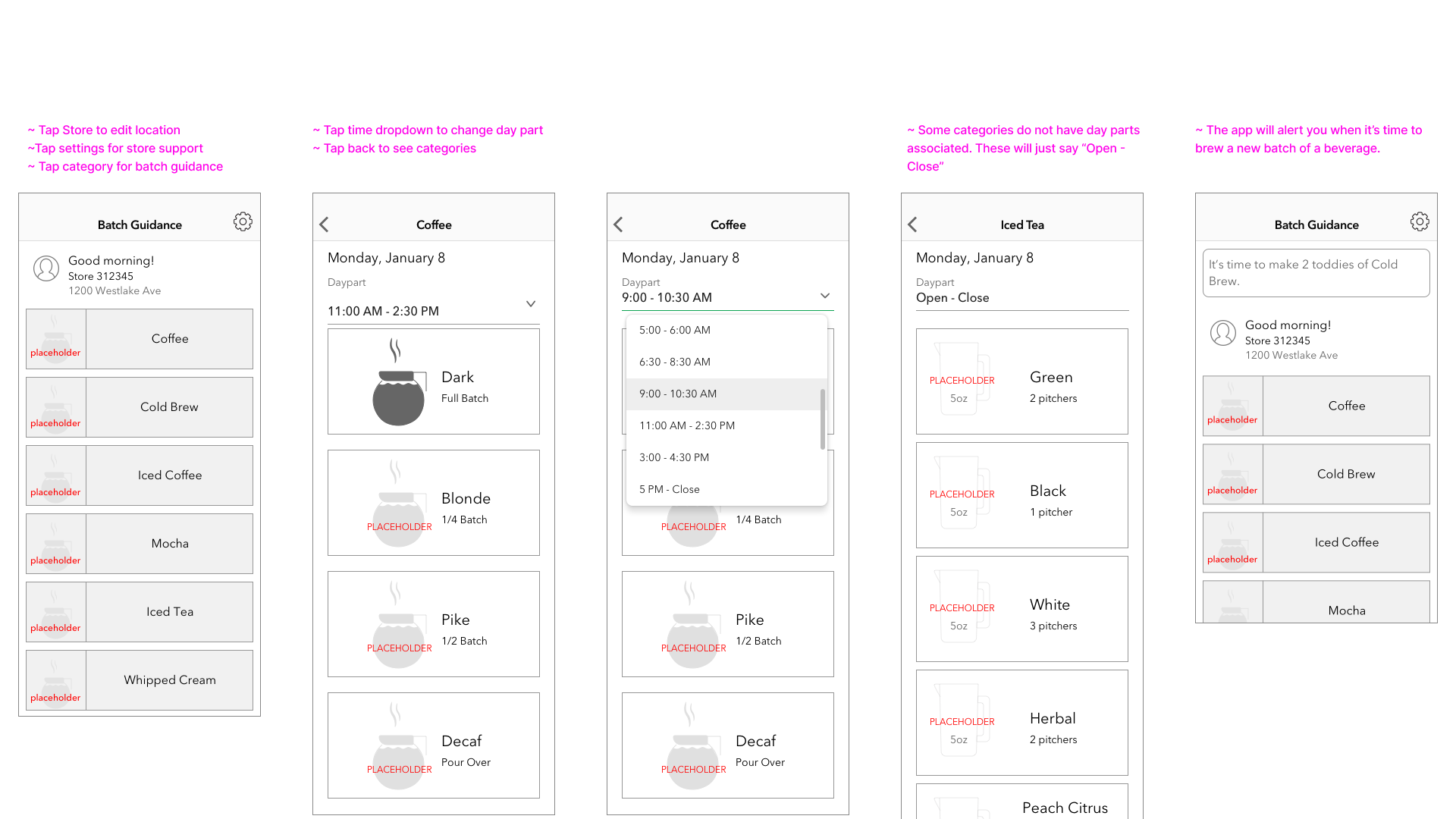 I started with a flow of the app, then sketched out a few different directions we could take. I did some quick paper prototypes to run past employees for feedback. Insights gained drove the direction of the designs. I worked closely with baristas to refine the app interactions, created prototypes to test on devices, and got it ready for development handoff. I worked closely with Product Management and Engineering to build this for all stores around the globe.