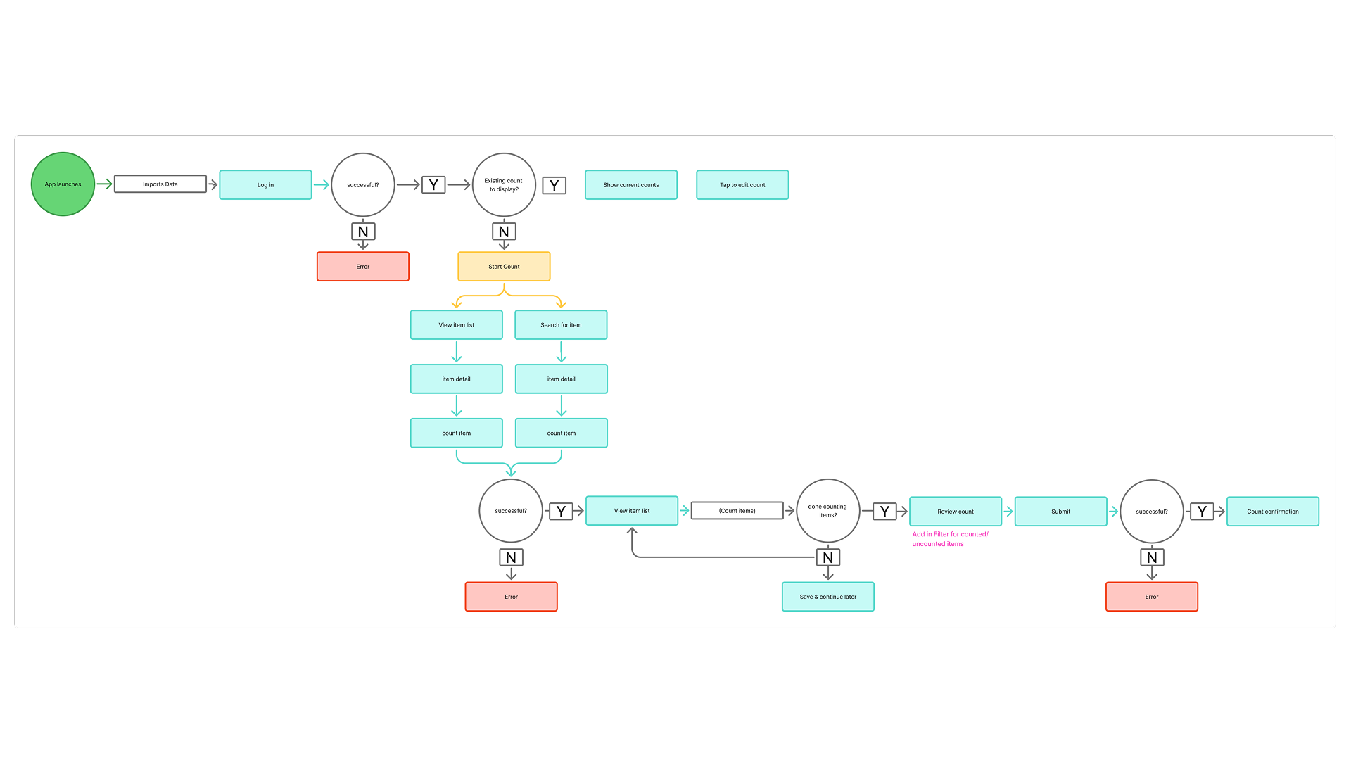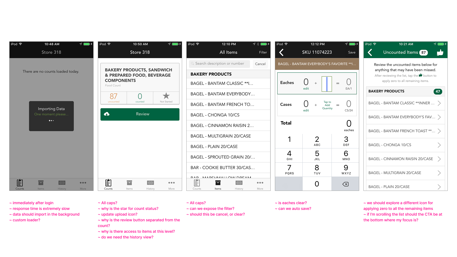 Details: We kicked off this project by visiting stores to observe how they were currently doing inventory counts, and interviewed baristas to help highlight pain points we could focus on. One of the things that came up during this discovery work was another challenge with the devices losing wifi coverage when going to different areas of the store to do the inventory. Not only did we need to create an online experience in this app, but find a way to retain information on the device and have it automatically upload upon wifi reconnect.
